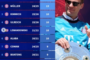 体育资讯4月20日讯 德甲第30轮比赛,拜仁以4-2的比分战胜斯图加特锁定本赛季的德甲冠军,诺伊尔、基米希、乌尔赖希等人再添一个德甲冠军奖牌。德国转会市场盘点了球员德甲获得德甲冠军的数量,诺伊尔和穆勒均拿到13个德甲冠军并列榜首,前10均为拜仁球员。
