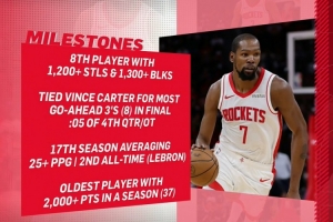 本赛季,杜兰特场均能得到26分5.5篮板4.8助攻0.8抢断0.9盖帽,他还达成了以下成就: